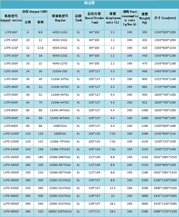 金斯柴油发电机组功率范围为4-2100KW。帕金斯具有体积小、重量轻、性能稳定、耗油量低、排放少等特点,其排放量是目前国内工业用发动机排放较低的机型,达到了欧共体、美国环保局对排放第三阶段(EU-/EPA Tier 3)规定的水平,金斯同时达到了德国TALuft的全部要求,满足法国对备用发电机组CO2限值的第二阶段的规定。