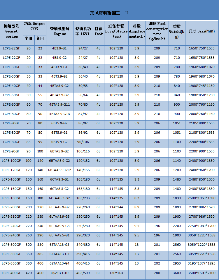 东风康明斯国二柴油发电机组产品型号及参数: